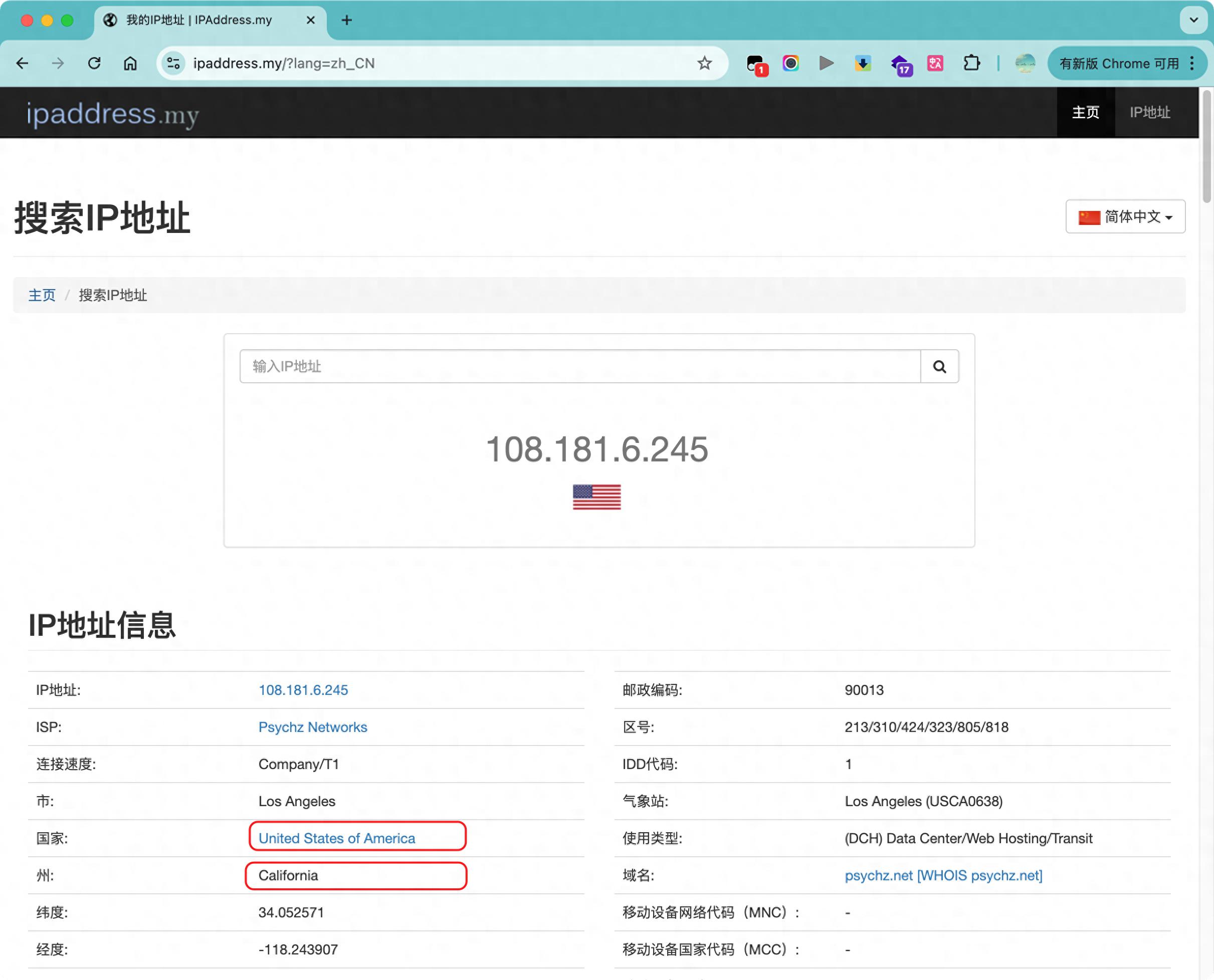 查看你当前IP的所属国家和省市,例如我的是 United States of America【美国】 + California【加利福尼亚】