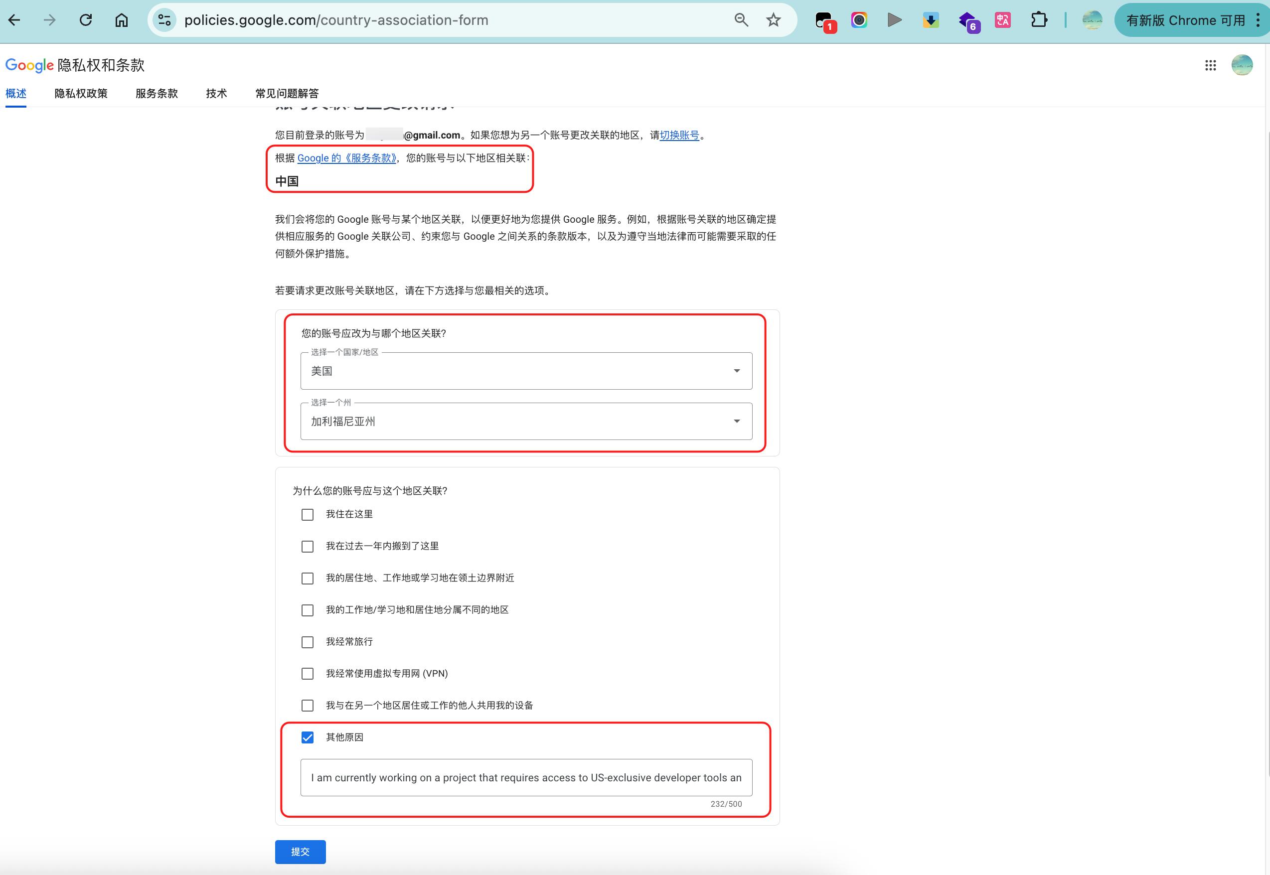 查看当前账号的归属地,如果不在支持的地区,访问:https://policies.google.com/country-association-form 申请修改地址