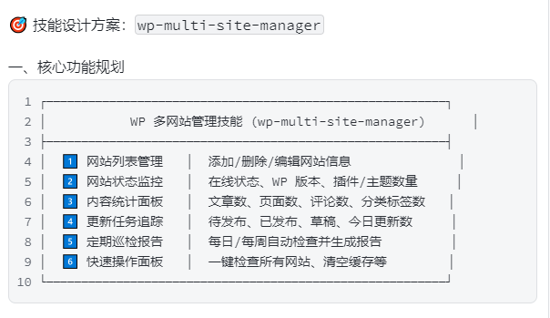 │ 1️⃣ wp-multi-site-manager │ 网站列表、状态监控、统计报告 │